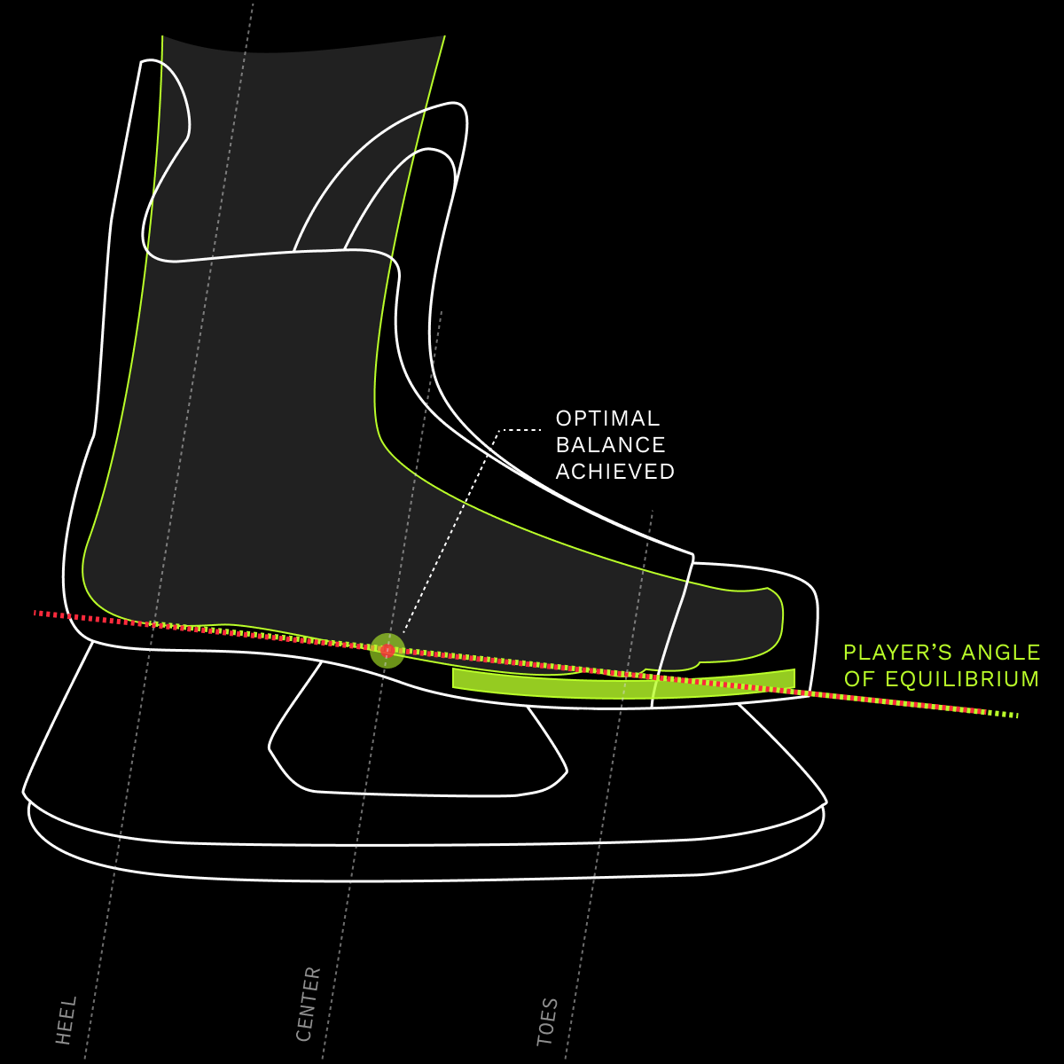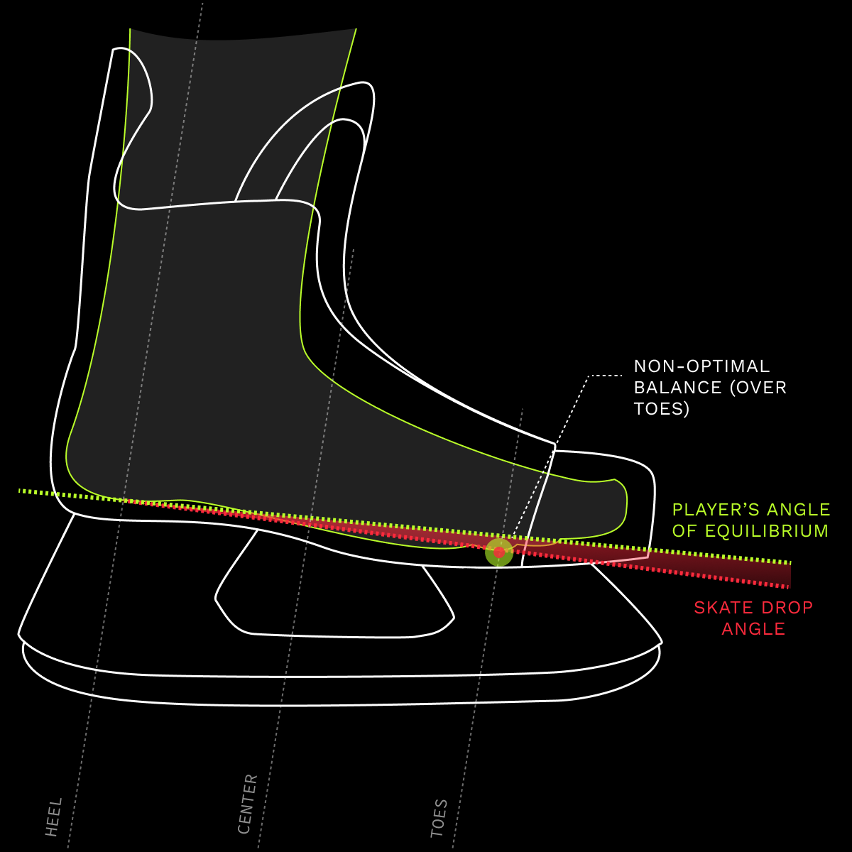 The majority of the time, the skate drop angle and the player’s natural angle of equilibrium are not the same, creating instability.
